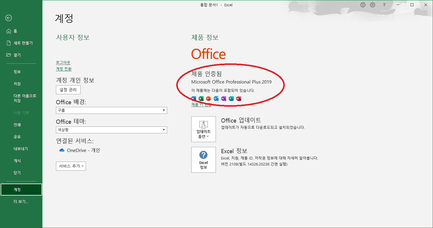 ▲ 오피스2019 정품인증 후 오피스2019 프로그램을 실행하시면 위와 같이 오피스 정품인증이 완료된 것을 확인하실 수 있습니다.