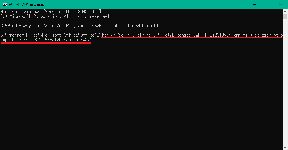 for /f %x in ('dir /b ..\root\Licenses16\ProPlus2019VL*.xrm-ms') do cscript ospp.vbs /inslic:"..\root\Licenses16\%x"